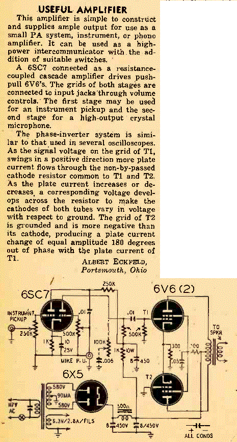 "Novel 10 watt amplifier for P.A." by W.N.Williams, Radio and Hobbies, April 1942. - Early practical amplifier using screen driven split 6V6G PP.